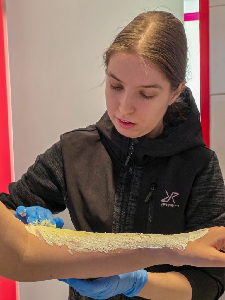 Bei der praktischen Prüfung wurden mit viel Aufwand und Detailliebe Notfälle aufgebaut und geschminkt. So werden die Prüflinge so realistisch wie möglich mit einem Notfall konfrontiert. Dazu gehören zum Beispiel Kopfverletzungen, eine Gabel in der Hand, Verbrennungen oder Frakturen. Aber auch schwerere Notfälle, wie etwa Schlaganfall, Herzinfarkt oder eine Vergiftung, sind Teil der Prüfungen. „Das A und O ist natürlich einzuschätzen, wann auf jeden Fall ein Notruf abgesetzt werden muss“, ergänzt Zimmer. „Wir konfrontieren die Schülerinnen und Schüler absichtlich mit eher schweren, sicherlich selteneren Szenarien, da sie auf diese Weise am besten lernen, wie sie ihr Wissen in einer besonders stressigen Situation richtig einsetzen können. Später im Alltag werden eher kleinere Verletzungen oder leichtere Erkrankungen vorkommen.“