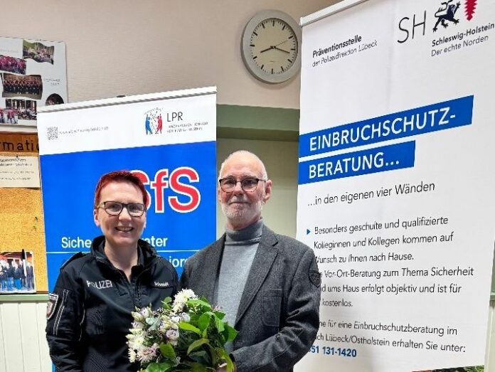 Lübeck – Knapp 11 Jahre setzte sich Gernot Schneider ehrenamtlich als Sicherheitsberater für Seniorinnen und Senioren in Lübeck und Ostholstein ein. Nach so vielen Jahren und ganzen 135 Vorträgen ließen es sich Leiterin Silke Ziemann und ihre Kolleginnen und Kollegen des Sachgebietes Prävention der PD Lübeck nicht nehmen, den ehrenamtlich engagierten ehemaligen Polizisten aus NRW gebührend zu verabschieden.
