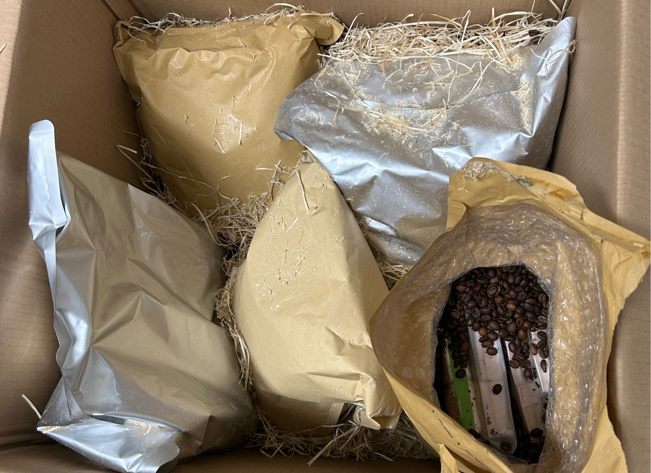 In jedem Karton befanden sich jeweils fünf Versandtaschen mit unterschiedlichen Gewichtsangaben. Neben lose eingefüllten Kaffeebohnen fanden sich darin jeweils zwei vakuumierte Plastikbeutel, die wiederum zwölf kleinere Päckchen mit der Aufschrift „Chocolate Puro“ enthielten.