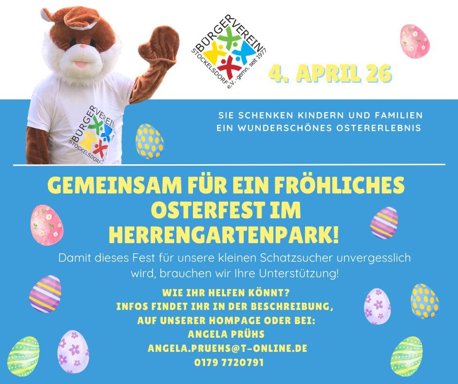 Herrengartenpark locken. Neben der beliebten Eiersuche sind verschiedene Spiele und Angebote für Kinder geplant. Damit das Fest reibungslos stattfinden kann, werden noch Helferinnen und Helfer gesucht, die bei der Betreuung der Spiel unterstützen. Zu den Aufgaben gehören unter anderem der Auf- und Abbau, die Begleitung der Spielstationen sowie die Anleitung der Kinder.