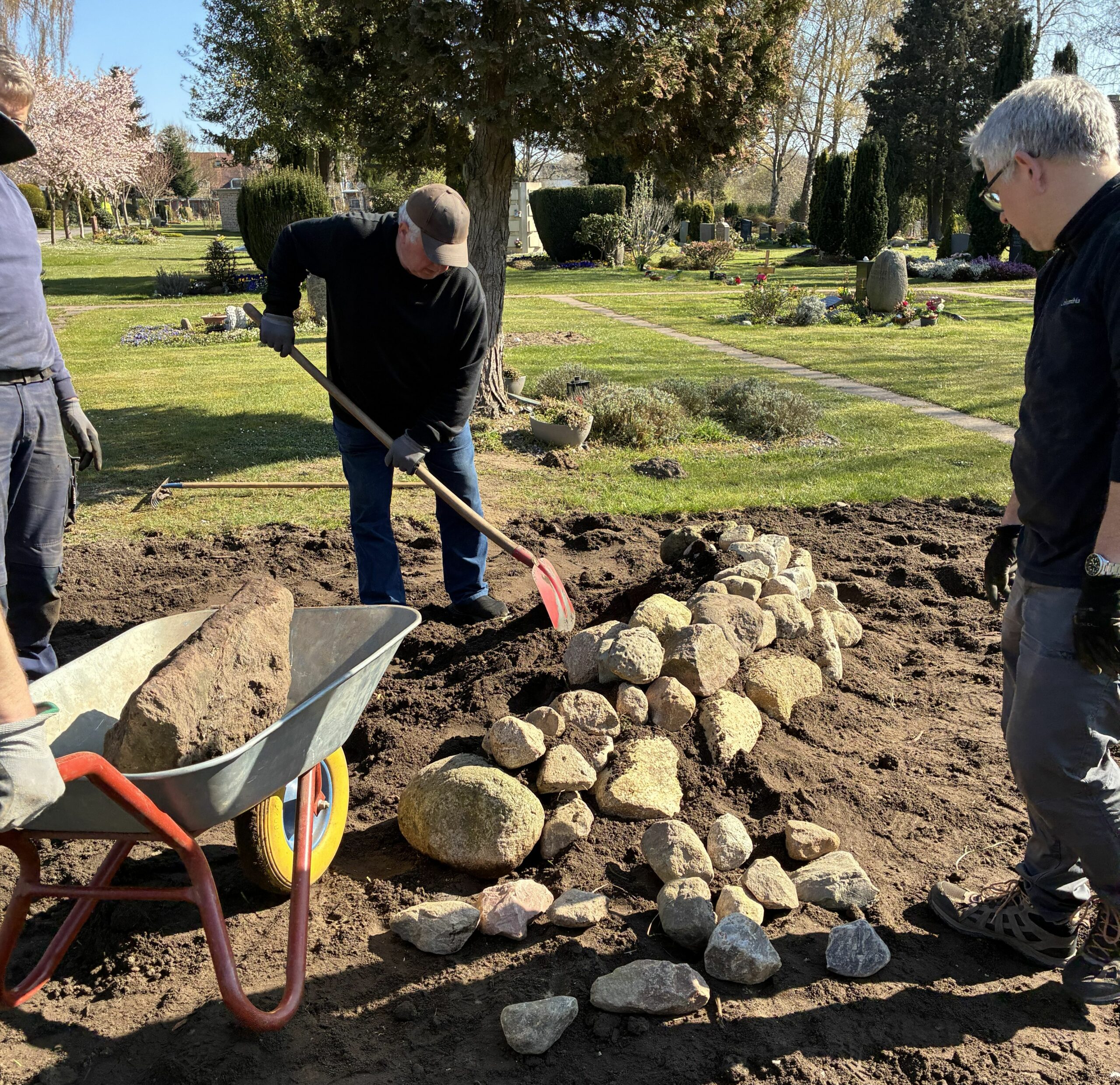 Bei freundlichem Frühlingswetter und Sonnenschein gelang dem Team – mit tatkräftiger Unterstützung des Friedhofs- beziehungsweise der Kirchengemeinde – ein großer Fortschritt. Alle Beteiligten haben hervorragend zusammengearbeitet und damit eine richtig positive, produktive Stimmung geschaffen.