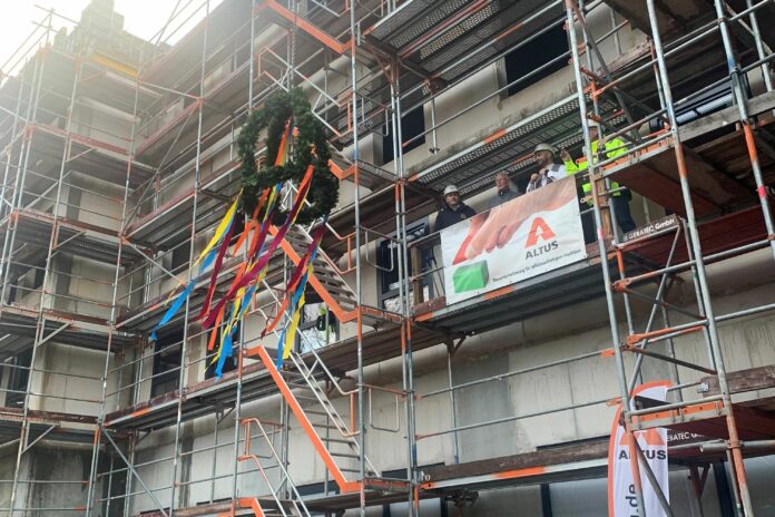 Donnerstag Richtfest gefeiert und damit das erfolgreiche Schließen der obersten Betondecke, da das Gebäude keinen