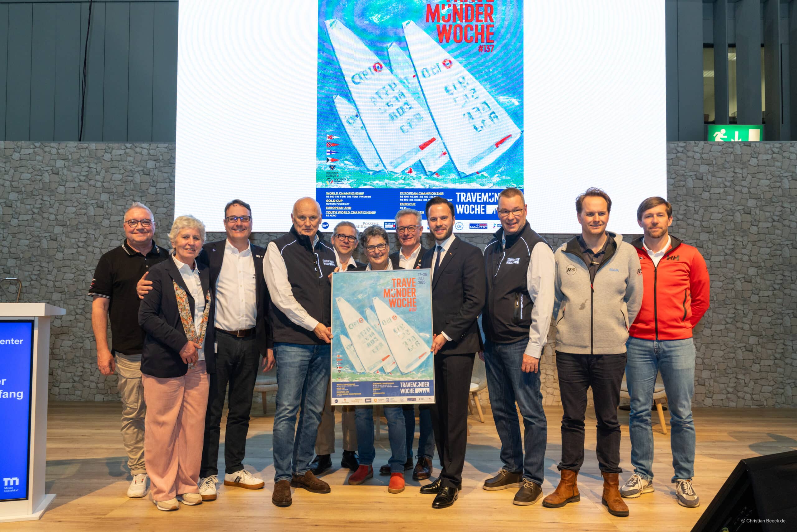 Düsseldorf – Die Travemünder Woche und die boot Düsseldorf hatten gerufen, und die große Familie der Segelsportbegeisterten kam zusammen. Am Sonntag, 18. Januar, wurde traditionell auf der größten Wassersportmesse der Welt das Regattaprogramm vom 17. bis 26. Juli 2026 vorgestellt. Doch die Travemünder Woche versteht sich mehr als eine reine Regattawoche – vielmehr sind die zehn Tage an der Travemündung auch ein Event für Feierlaunige, Fans internationaler Kulinarik, Freunde klassischer Musik und Liebhaber von lauschigen Momenten in sommerlicher Atmosphäre. Das wurde beim Empfang der Travemünder Woche deutlich, in dessen Rahmen das druckfrische Plakat der Regattawoche, wieder gestaltet von Lübecks Maritim-Künstlerin Frauke Klatt, vorgestellt wurde.
